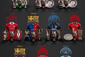 凯尔特人、阿贾克斯、埃因霍温、曼联、巴萨x2、国米、拜仁x2、曼城